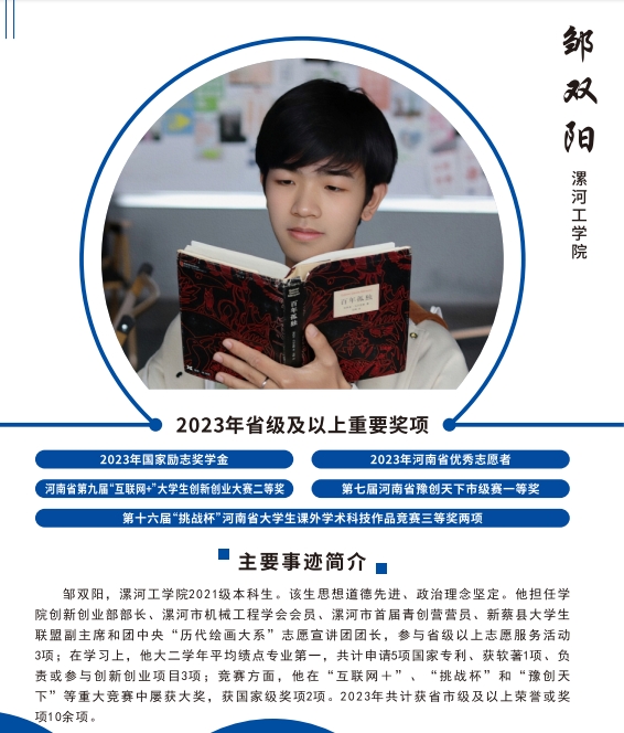 邹双阳同学思想品德高尚,政治理念坚定,热爱志愿服务活动,参与省级以上志愿服务活动3项;学习上成绩优异,大二学年平均绩点位列专业第一,共计申请5项国家专利,获软著1项;竞赛方面,在“互联网+”“挑战杯”和“豫创天下”等重大竞赛中屡获大奖。2023年共计获得省市级及以上荣誉或奖项10余项。