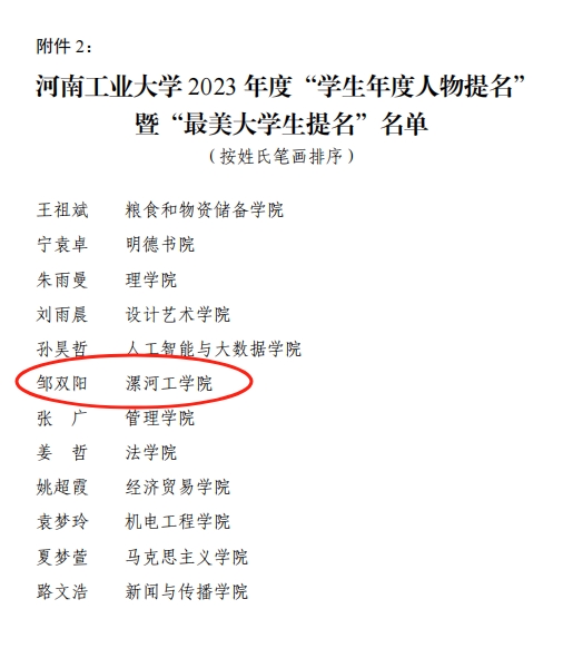 为充分展示青年学生积极进取、奋发向上的精神风貌,发挥新时代大学生先进典型的示范引领作用,近日,pg娱乐电子游戏官网入口2023年度“学生年度人物”暨“最美大学生”校级评审展示会圆满举行。pg娱乐电子游戏官网入口学生邹双阳获2023年度“学生年度人物提名”暨“最美大学生提名”荣誉称号。