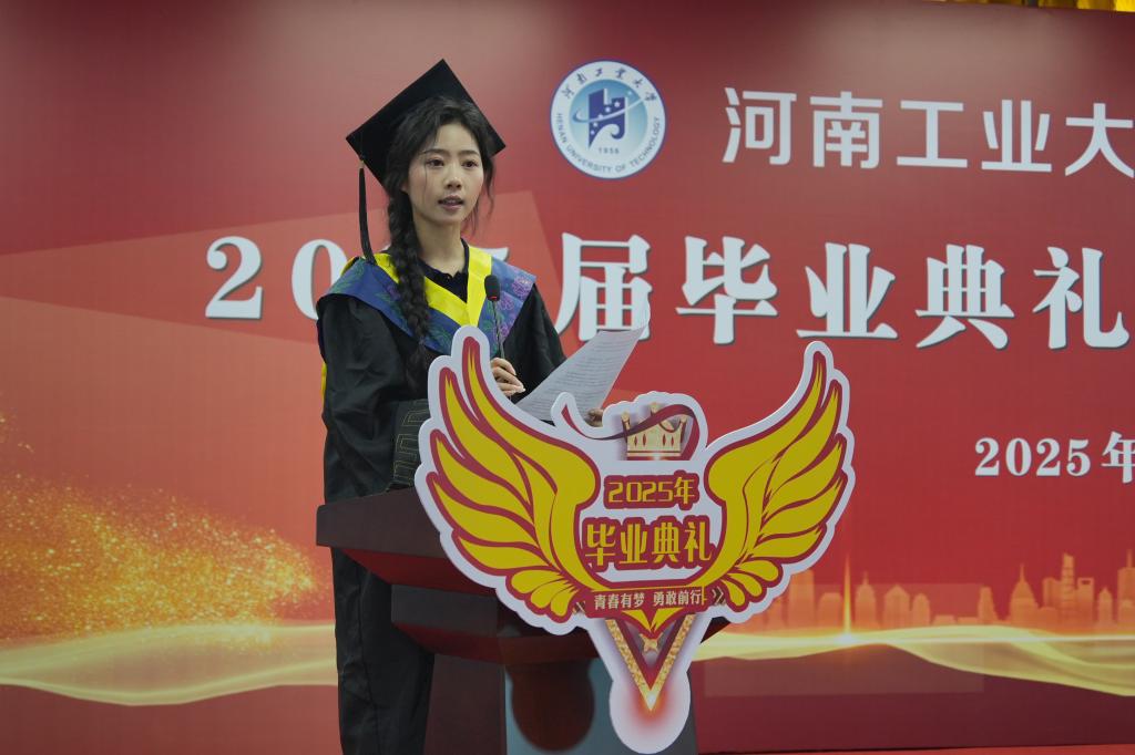 毕业生代表霍申雪发表感言,回顾求学生涯,感恩师长栽培,并表示将谨遵教诲,为追逐梦想而破浪前行。