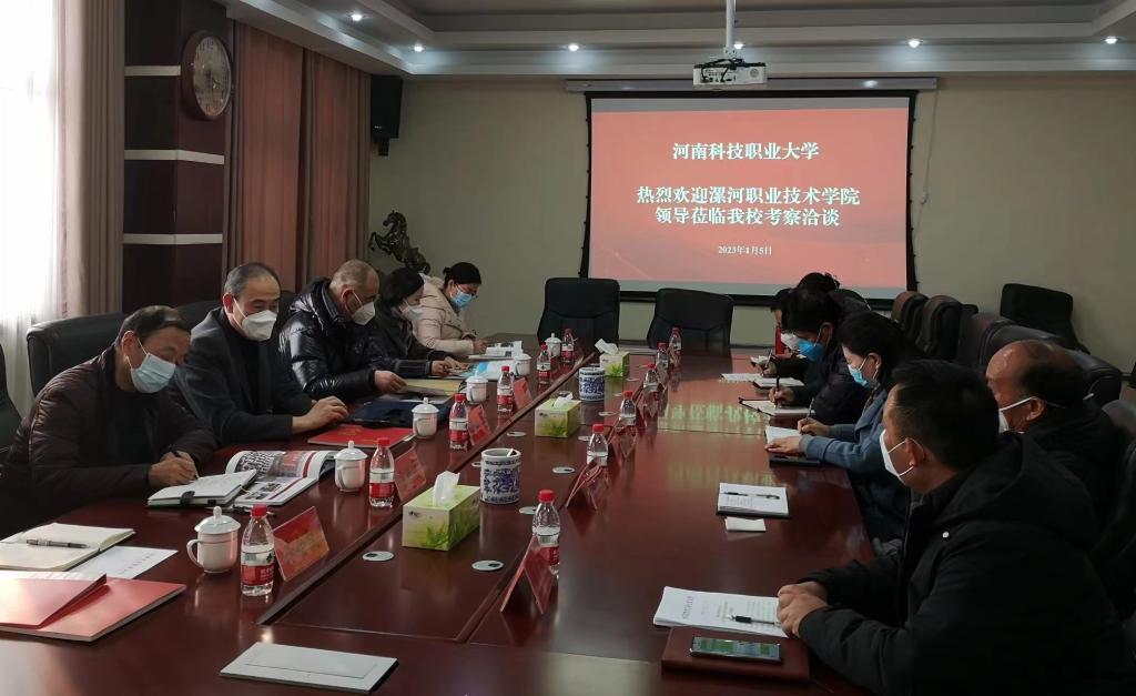 为落实《河南省教育厅办公室关于申报职业本科人才贯通培养改革试点工作的通知》(教办发规〔2022〕404号)文件精神,1月5日下午,学校党委副书记薛存心、校党委委员易春林与本科综合办、教务处和五年制教学部负责人赴河南科技职业大学洽谈中本贯通人才培养合作事项。河南科技职业大学理事长李海燕、常务副校长马金岭 、副校长许德宽及校办公室、教务处、经管学院等部门负责同志参加会议。