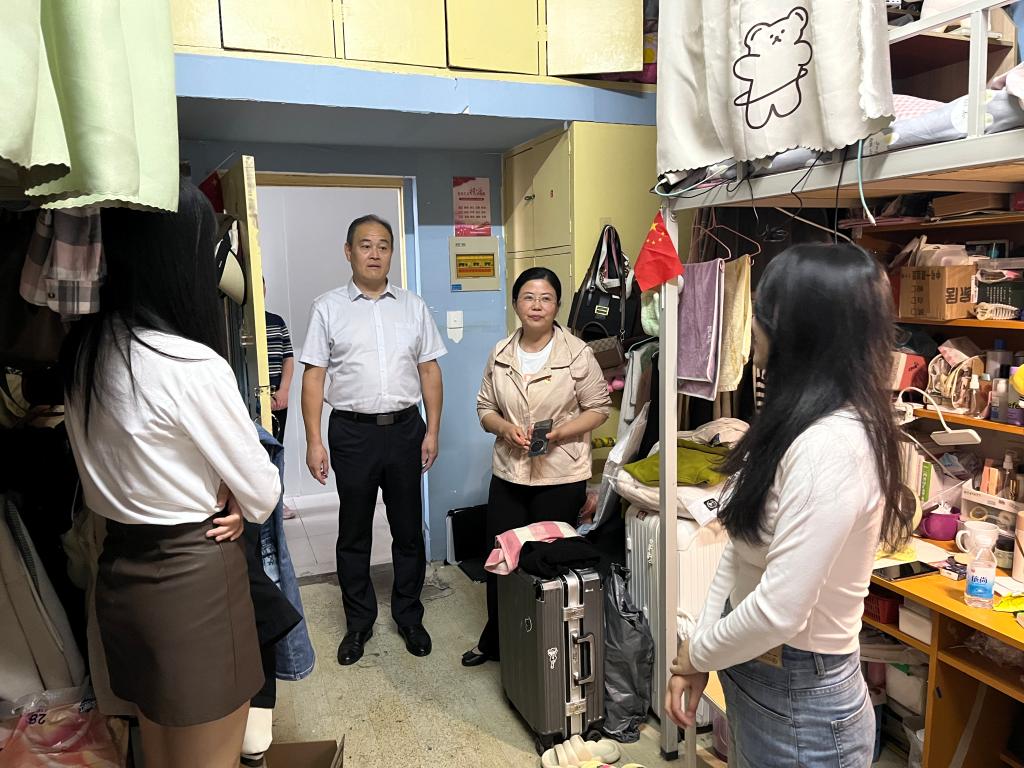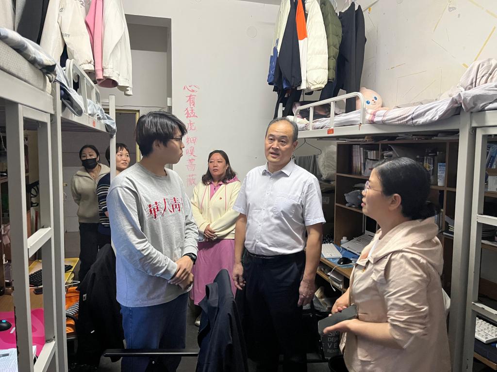 薛存心一行分别走访了15、16号宿舍楼,仔细查看同学们的住宿环境,询问维修进度,倾听大家的意见和建议。“最近生活怎么样?”“考研报上名了吗?”“有需要解决的问题没?”……亲切的话语迅速拉近了师生间的距离,也让学生感受到了学校的关怀和温暖。薛存心勉励学生们要珍惜剩下的大学时光,合理规划自己的未来,夯实专业基础,提升综合素质。针对考研的学生,他提出要明确学习任务,及时关注相关学校考研网站与招生简章,发扬艰苦奋斗的精神,在冲刺阶段化压力为动力,不焦不躁,以良好的心态备战。在备考中遇到困难可以及时和老师们沟通,学校是大家坚强的后盾,会在考研征程上一路护航。