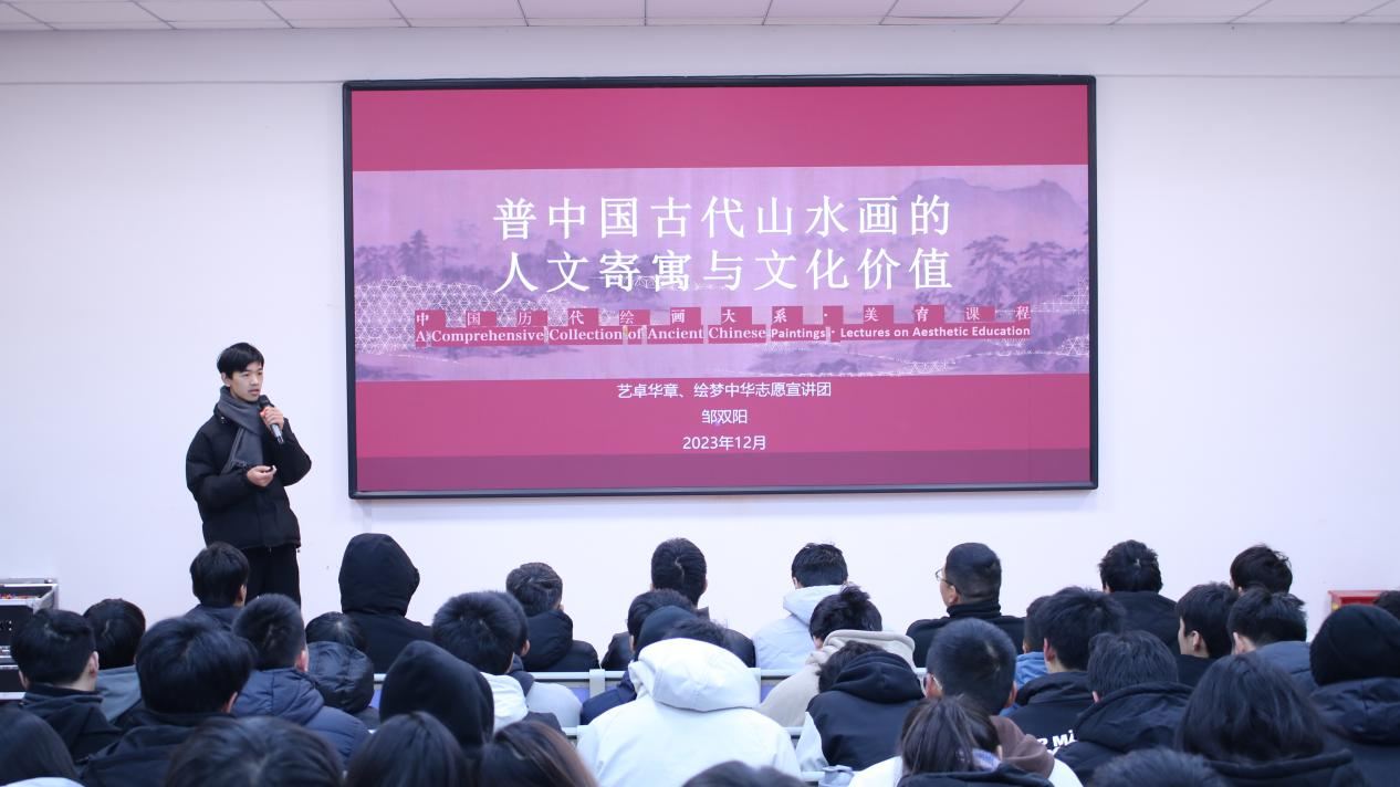 为弘扬中华优秀传统文化,帮助大学生群体更好地担负起新的文化使命,根据团中央的工作安排,pg娱乐电子游戏官网入口“艺卓华章,绘梦中华”志愿服务团于2023年12月20日下午在二号教学楼2107开展“中国历代绘画大系”传统书画知识分享会,以青年的视角生动阐述了中国山水画的独特魅力与价值。