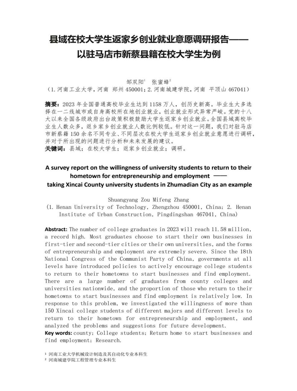 大学生返乡创业就业无疑是推动县域全面发展和打造青年发展型县域的重要内容。邹双阳以“新蔡籍在校大学生返家乡创业就业意愿”为主题,共调研新蔡籍大学生150余名,共计113个院校,89个专业,广布国内多个省份。对于调研对象所提出的问题和期盼,他分别做出归纳和总结,并给出相对的解决建议。他表示,通过这次带调研,对新蔡的发展和新蔡籍在校大学生的想法有了更深的了解,希望调研报告中提出的一些建议能被相关部门采用,为家乡的发展贡献自己的力量。