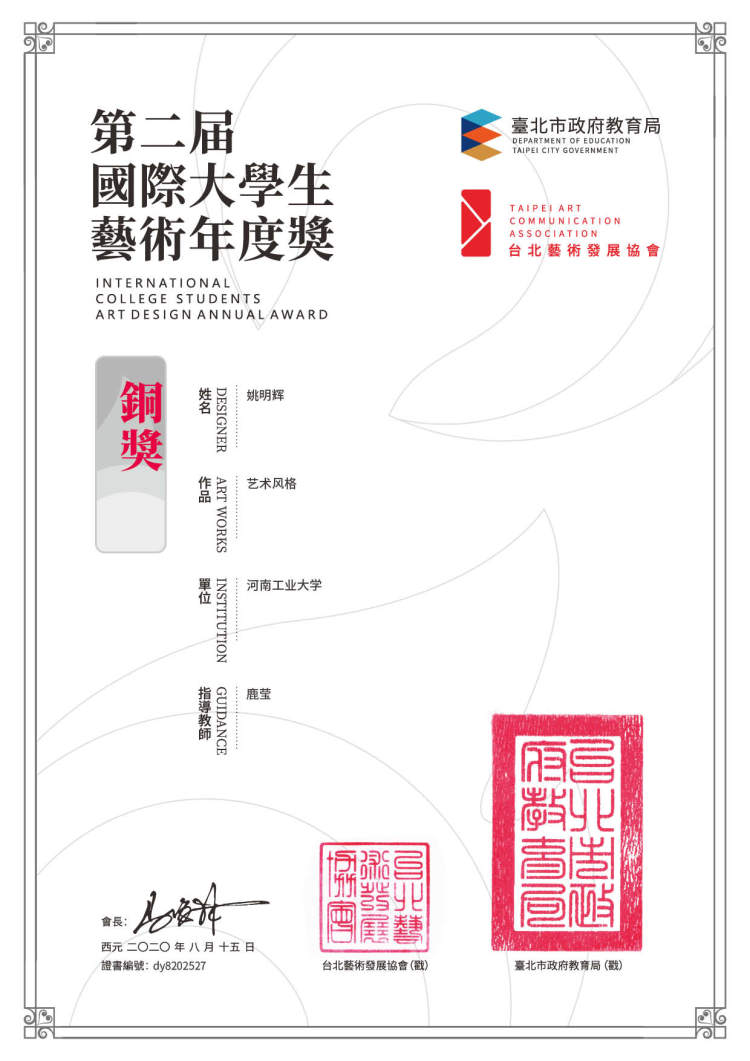 第二届国际大学生艺术年度奖由台北市政府教育局发起主办,联合台北艺术发展协会承办,此次赛事主要面对区域为中国大陆地区中国台湾地区、中国香港澳门以及新加坡地区的一项国际性设计大赛,将传统文化、当代文化、当代艺术用新思维艺术形式进行更加科学的传播,以达到将艺术与传播融合。